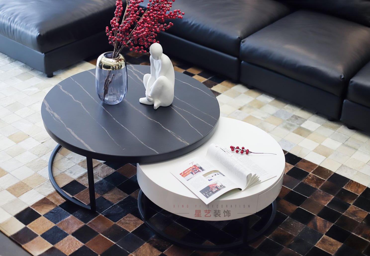 客廳首先就給人一種清幽的意境,黑色的皮質沙發(fā),搭配上拼接的黑白圓桌和深褐色的格子地毯,吊燈也沒有用復雜的水晶燈,而是是簡約又設計感的圓管白燈,合理的空間分配平衡了厚重天花板帶來的壓迫感,把黑白灰的高級感發(fā)揮到了極致。
