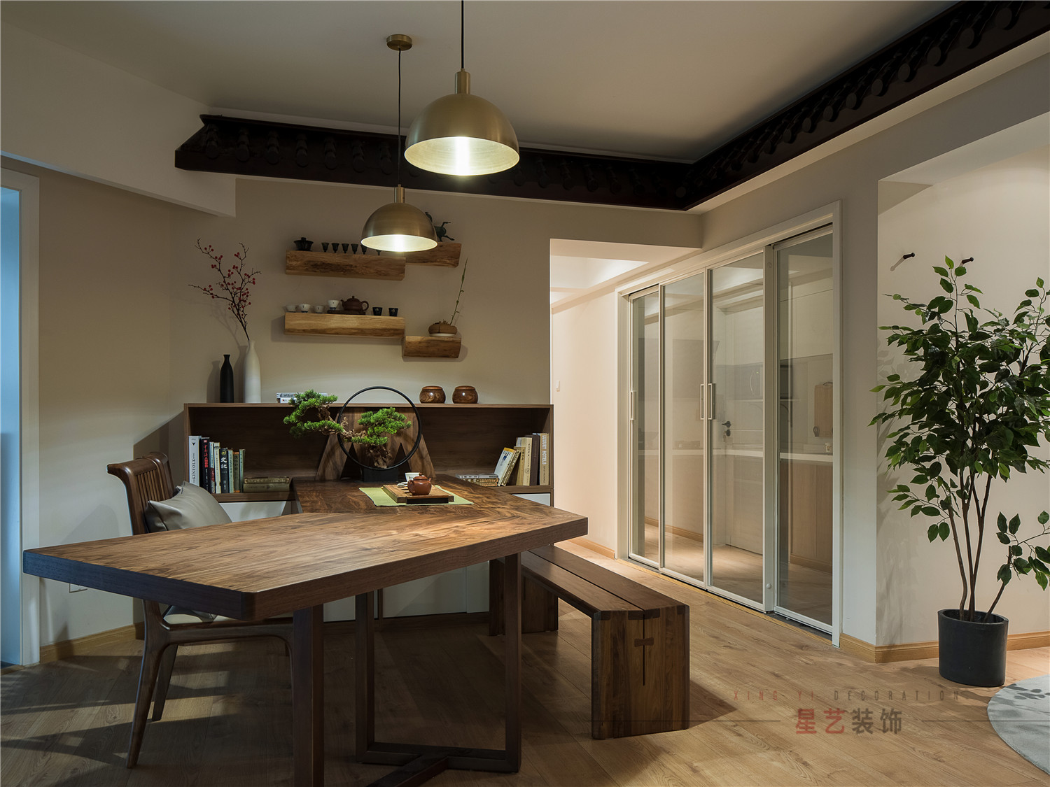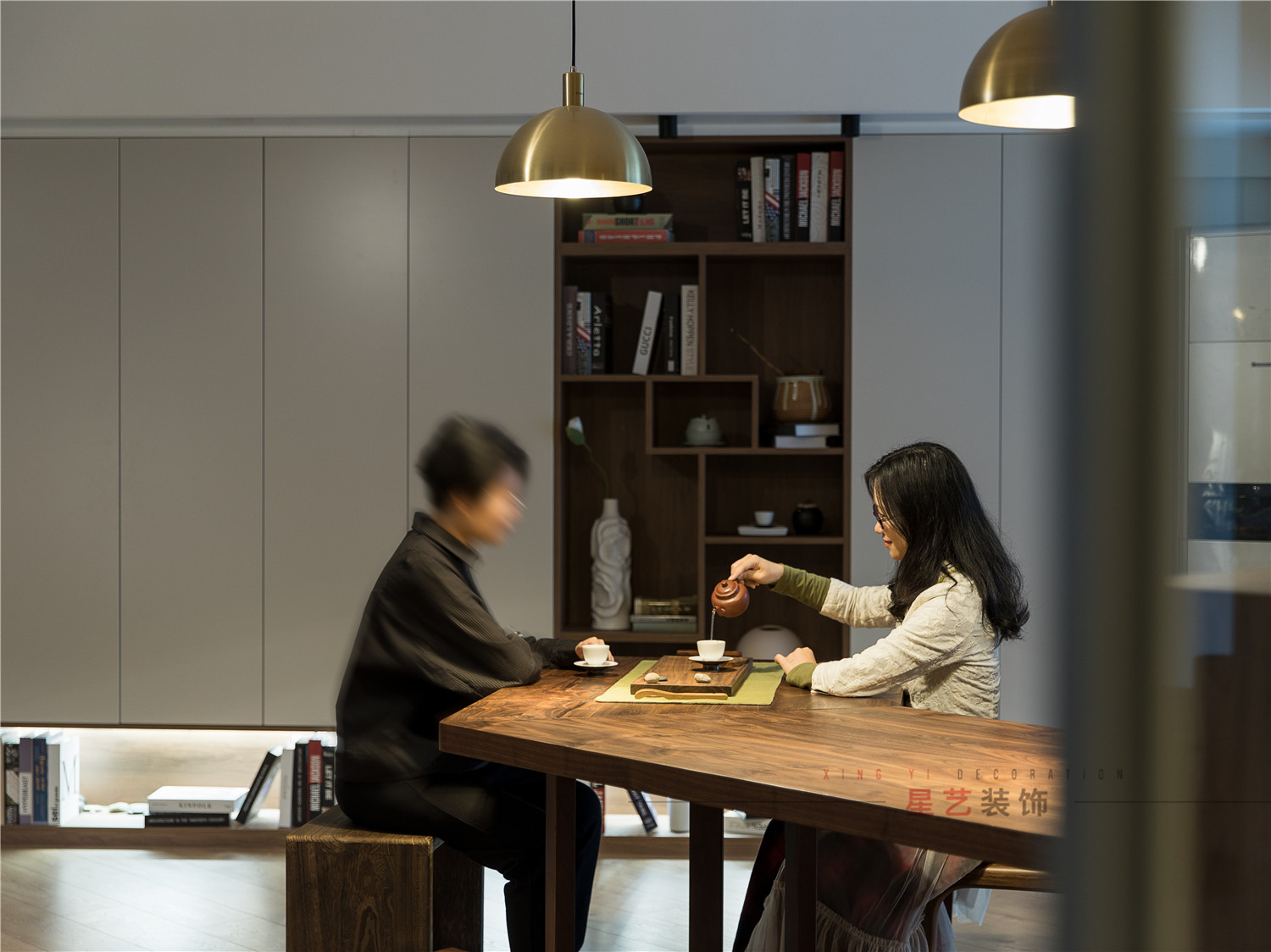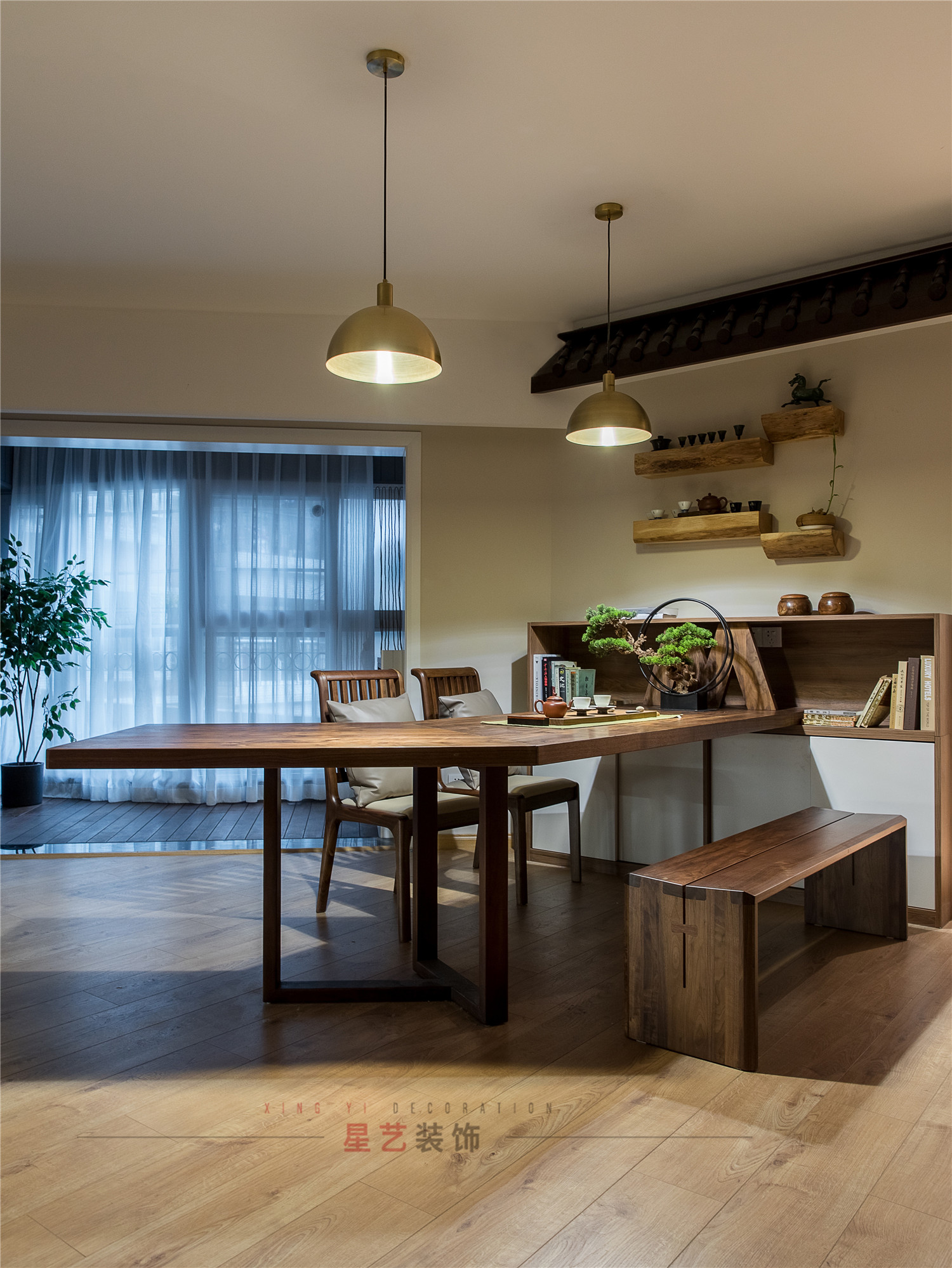 餐區(qū)才是家庭的主要活動(dòng)區(qū)域,設(shè)計(jì)師特意訂制了超大的異形實(shí)木桌,滿足客戶用餐、辦公、泡茶談琴、寫字與孩子做作業(yè)的功能。