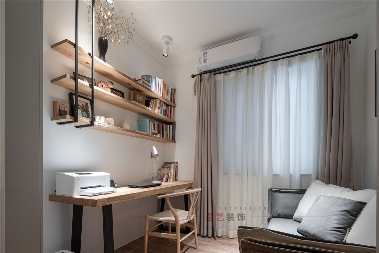 書(shū)房屬于下班后得工作區(qū),沒(méi)有過(guò)多的裝飾,原木色的置物架和復(fù)古座椅,樸素簡(jiǎn)約,不管是日常的還是孩子學(xué)習(xí)都能有個(gè)舒適安靜的角落,累了還能在沙發(fā)上休息片刻,平凡又幸福的生活莫過(guò)于此。