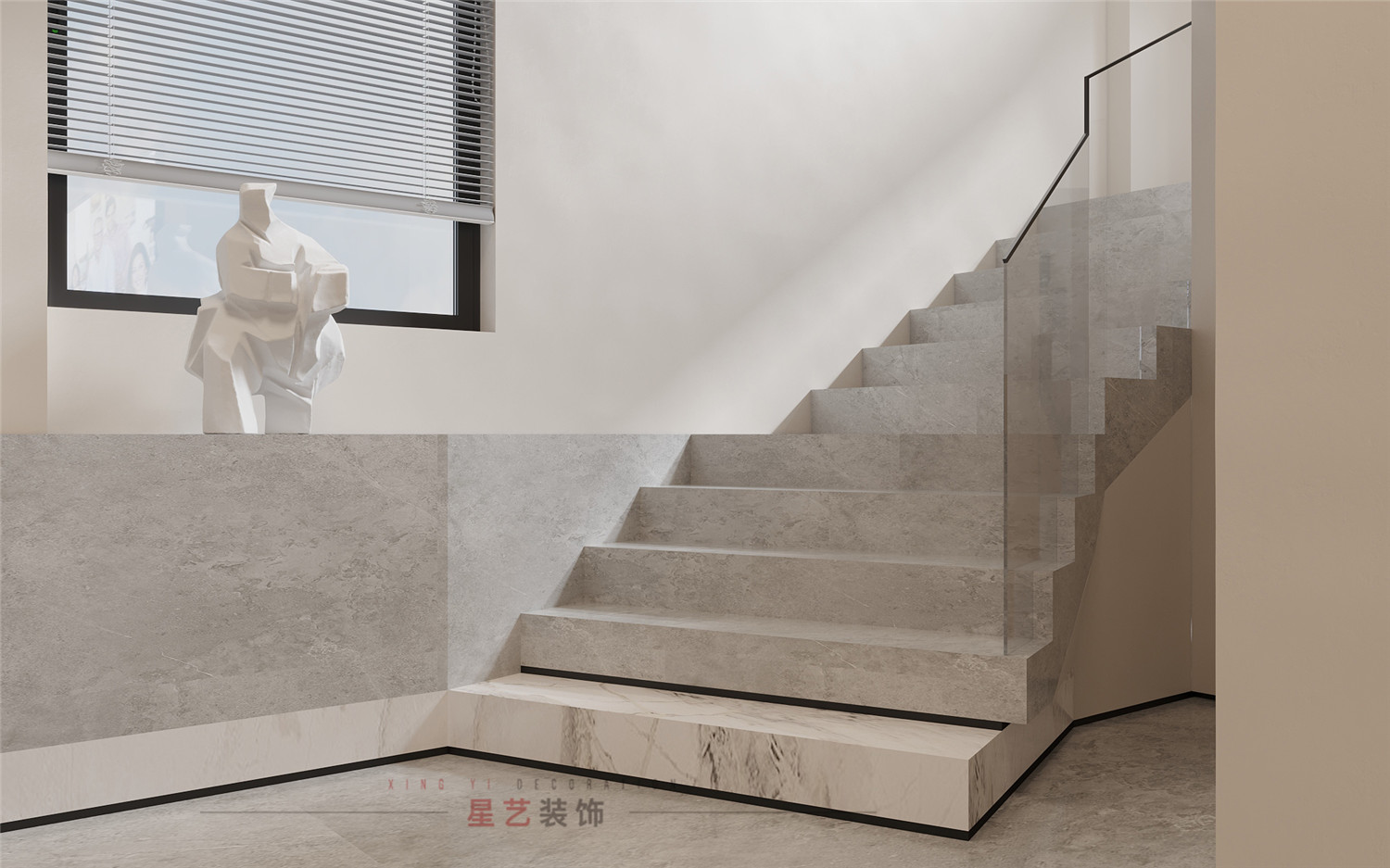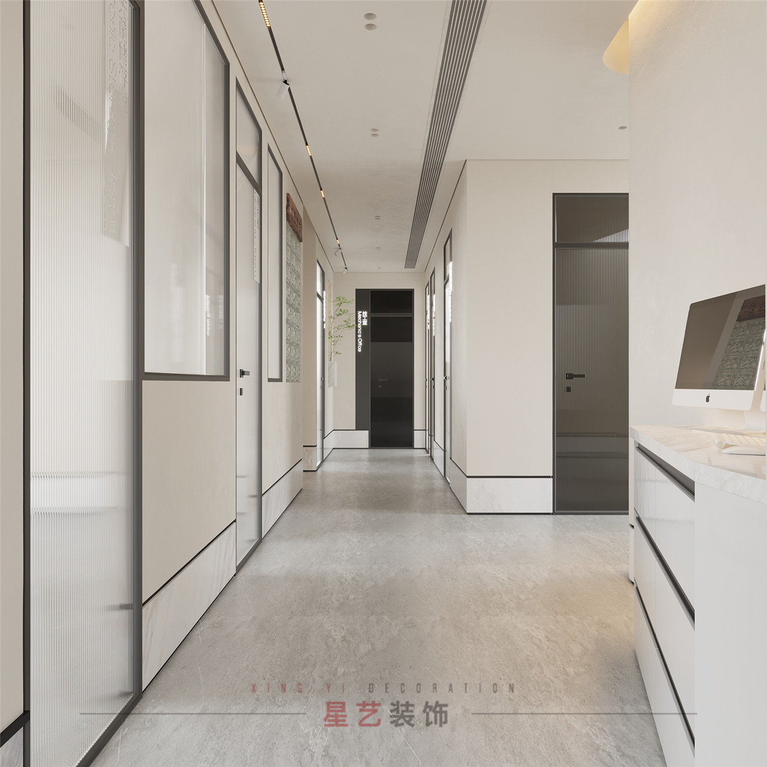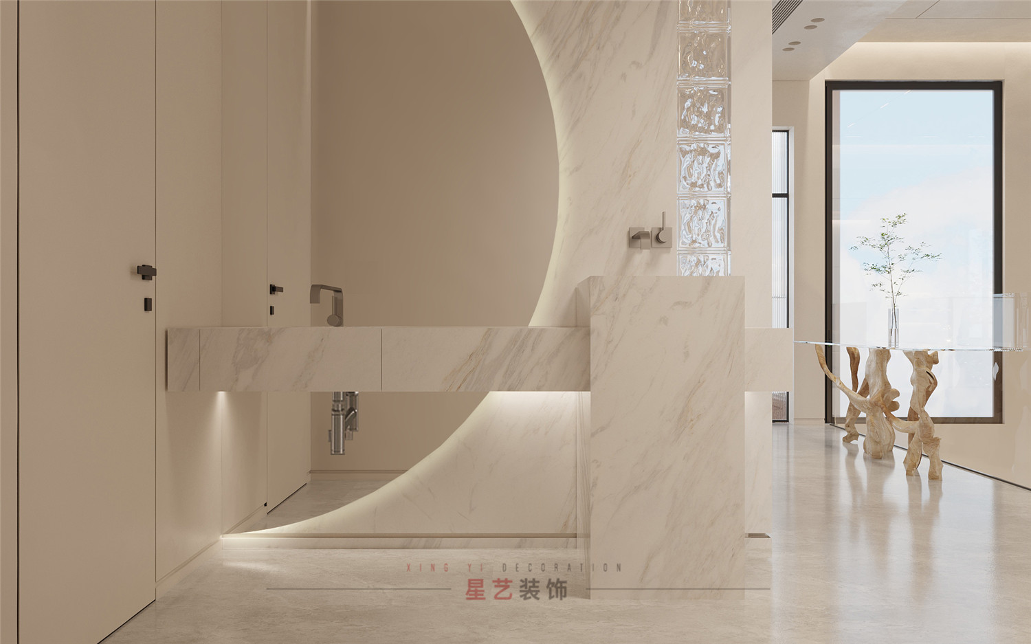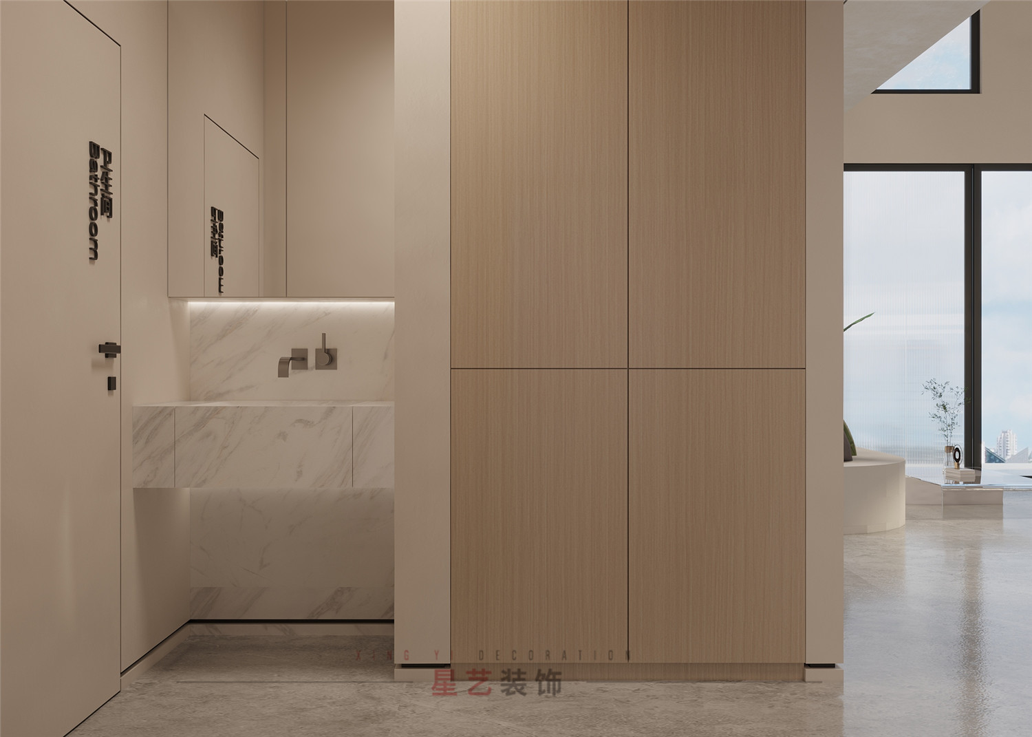 過道處設有衛(wèi)生間,洗手臺,便捷舒適。墻體與玻璃門都有運用大面積枯山水紋路,詮釋深刻的禪宗美學,從而實現(xiàn)“無水而喻水”的效果,強化細節(jié)體現(xiàn)。