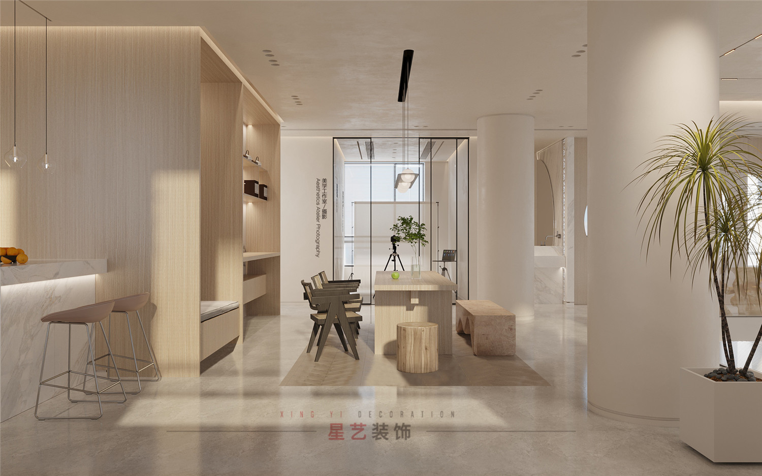 材質(zhì)及顏色分析:米咖色系,禪意詫寂風、多種木紋材質(zhì)紋理襯托、大理石原色點綴。