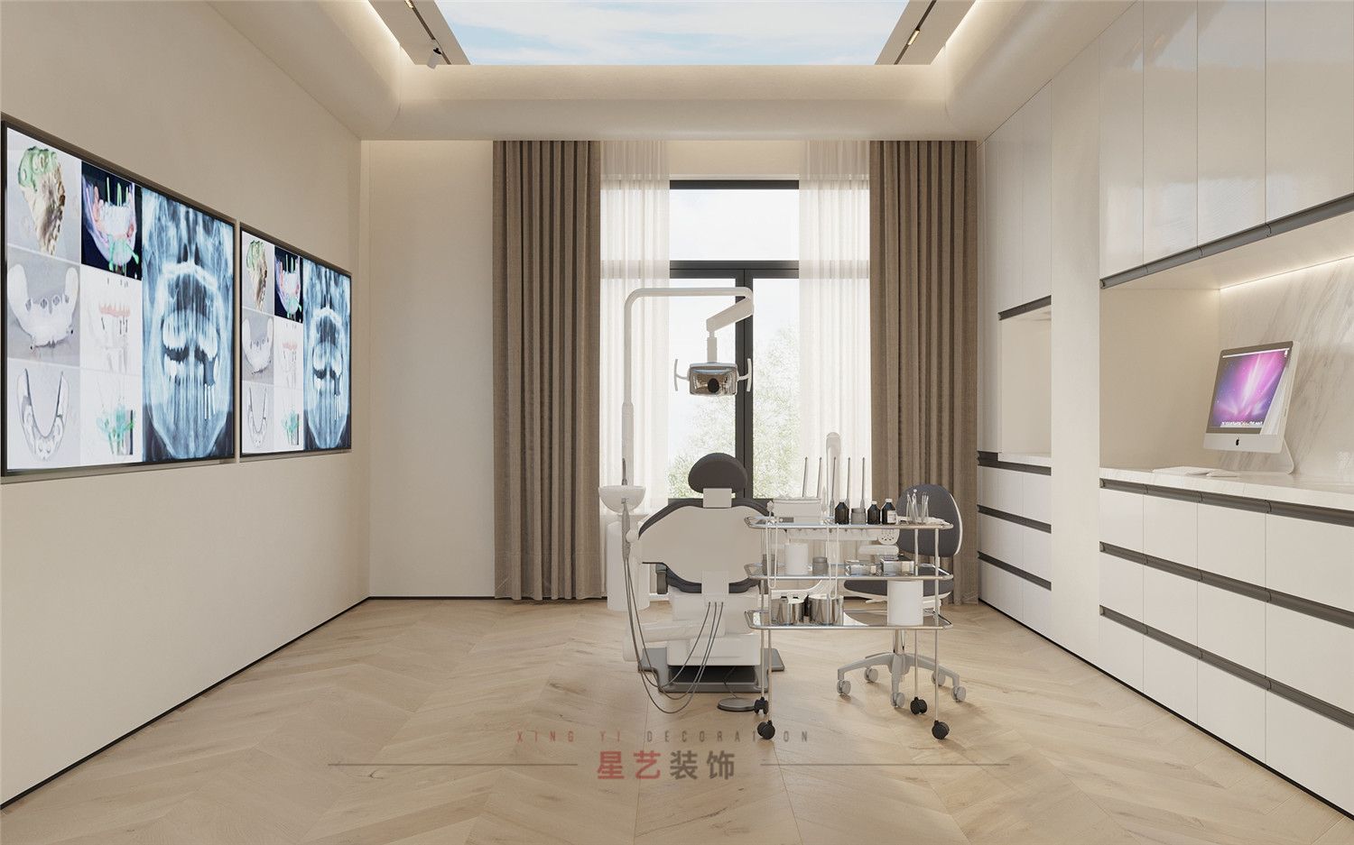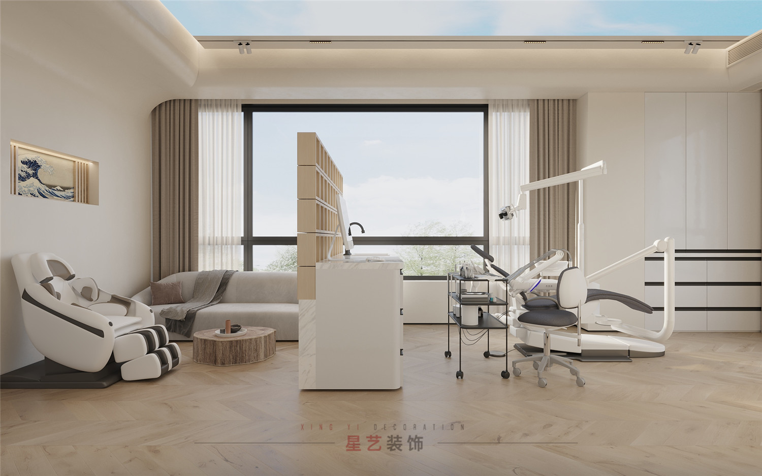 不同功能的診室強調(diào)的是實用性與舒適性。牙科ct室用高級灰+白打造靜謐的獨立空間;種植室和正畸室增加了主機和鍵盤位區(qū)域,主要設備也都正對窗臺,一縷朝陽落下,整個功能區(qū)都呈現(xiàn)出柔和治愈的色彩,忐忑不安的心也慢慢平靜下來。