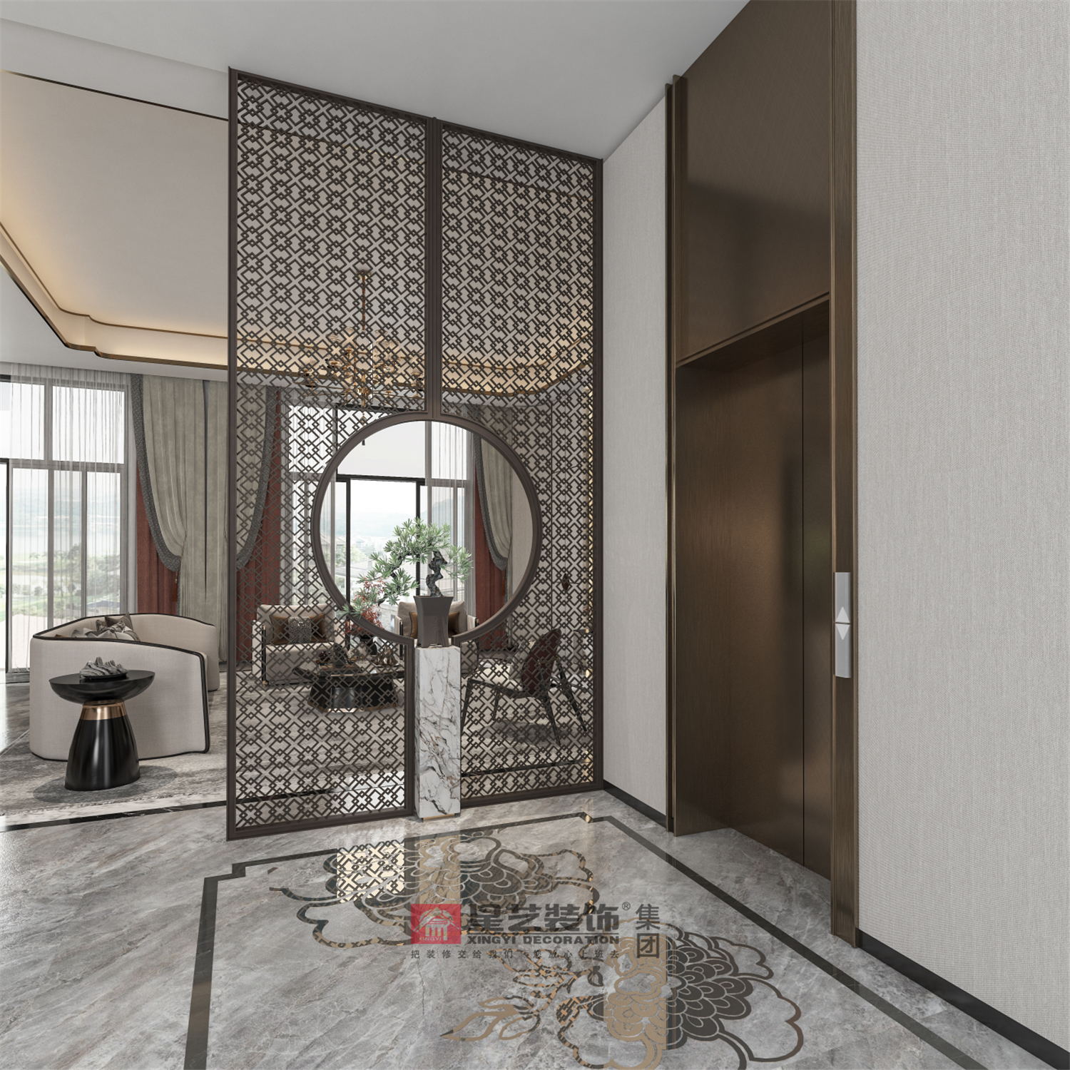 地面采用女主人喜歡的銀杏葉與祥云元素,配上隔斷屏風隔而不斷,即起到風水上的擋煞作用。并以石材原木與金屬為主要材質,把東方氣韻下的低調典雅呈現的淋漓盡致。